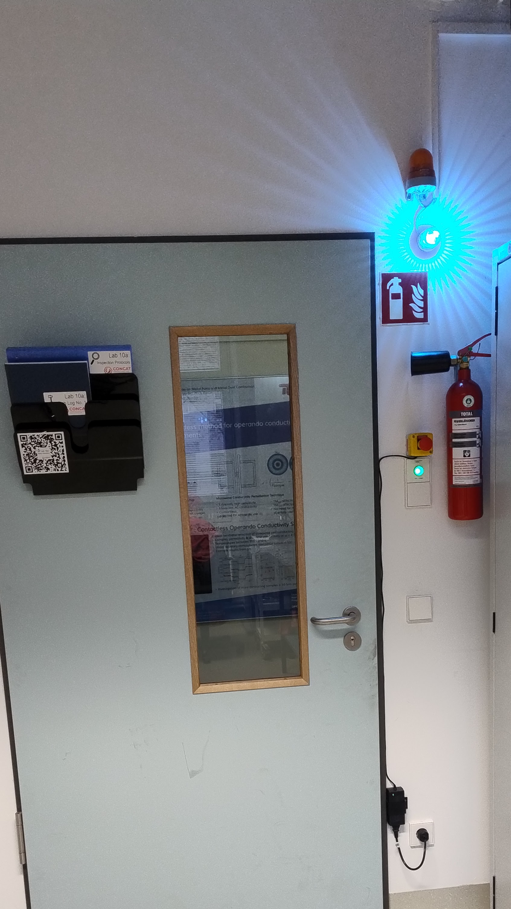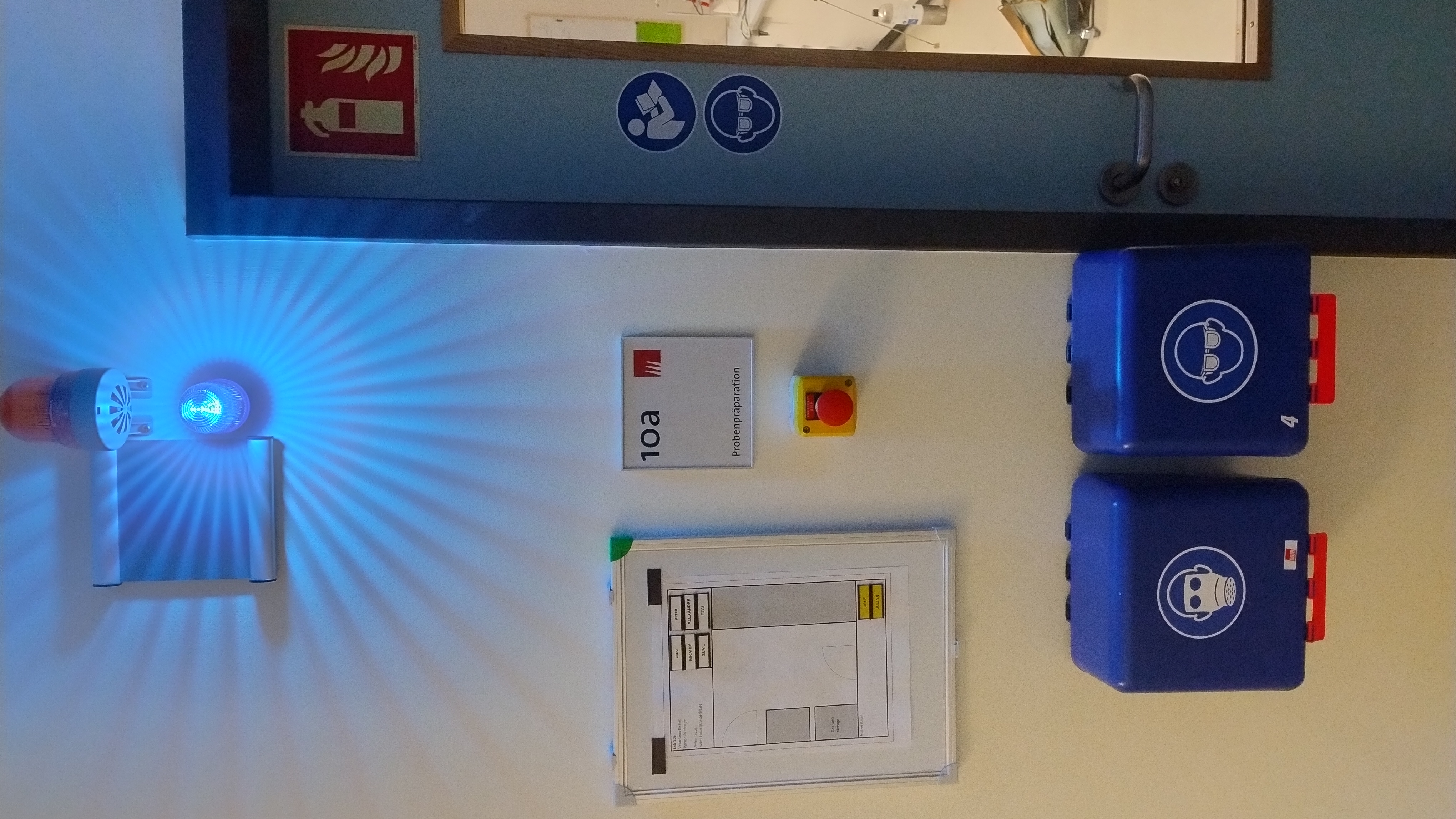 The blue beacons inside and outside of the lab are connected to the gas cabinet shut-off circuit. When the circuit is on, the toxic gas caution light indicates that the solenoid valves installed on top of the ventilated gas cabinet are open. This means, that the gases labelled blue in the list gases connected to the gas cabinet lines are available at the pressure reducers (link to photo).