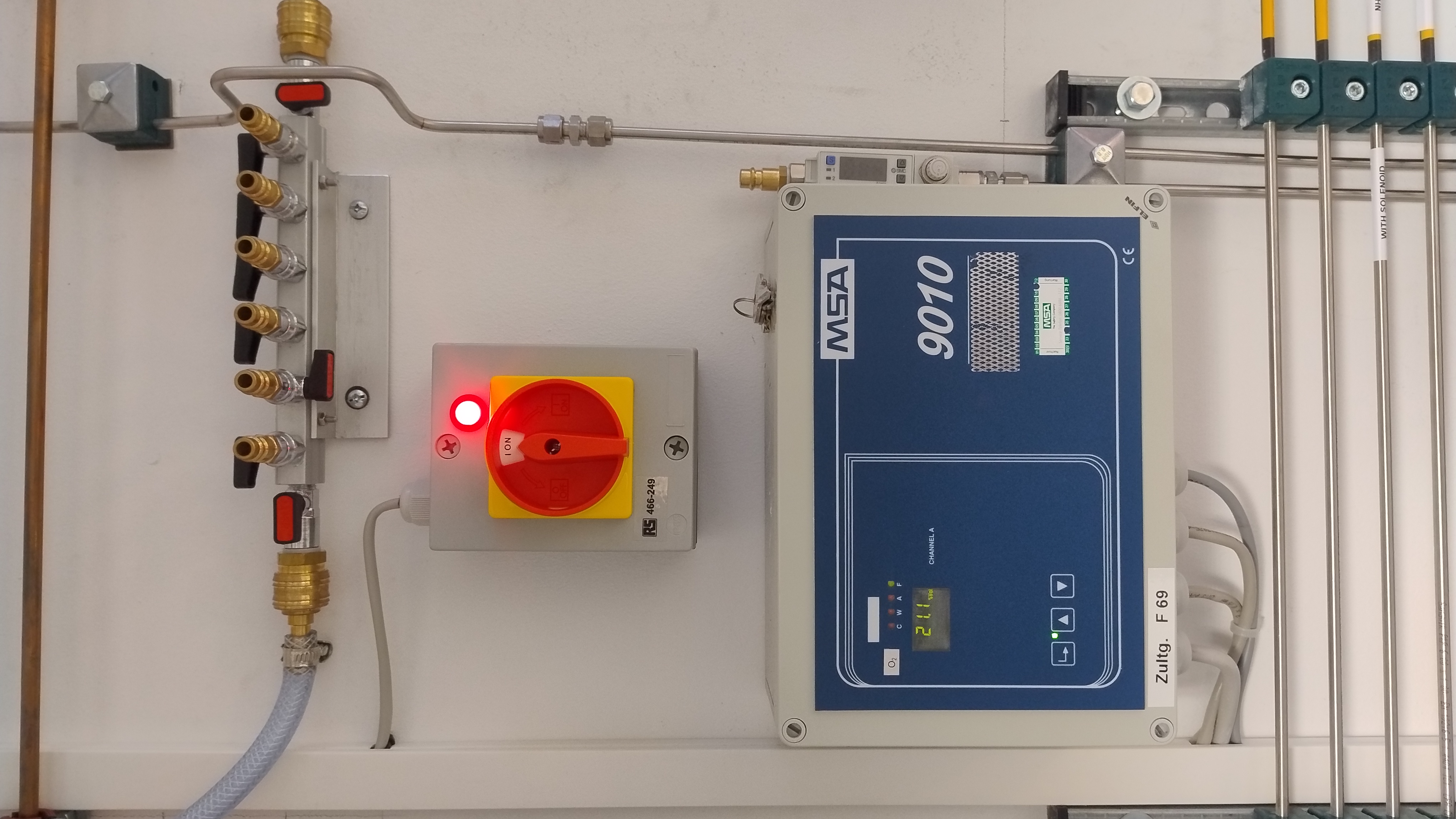 The orange beacons outside and inside the lab are connected to the oxygen level sensor in the lab. The low oxygen level alarm will trigger in case a dangerously low concentration of oxygen, below 17%, i.e. when there is a risk of asphyxiation. The alarm is equipped with both an alarm light and a siren.